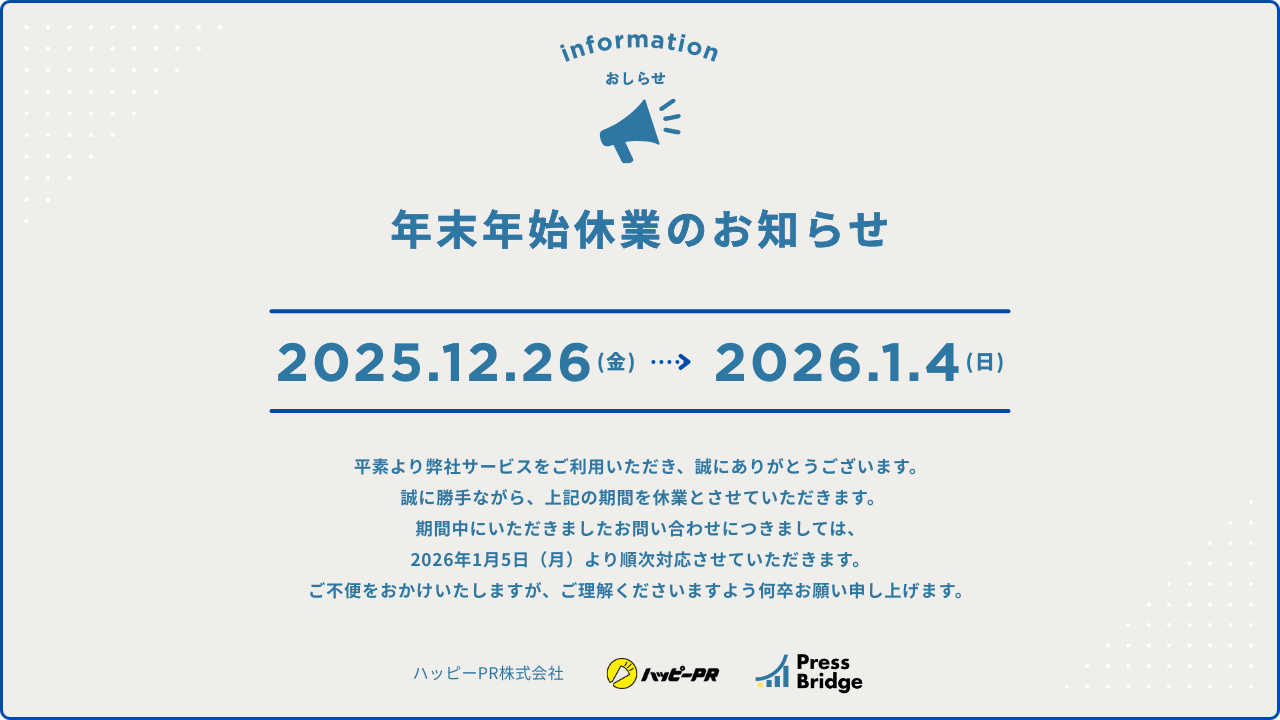 年末年始の休業期間:2025年12月26日(金)~2026年1月4日(日)