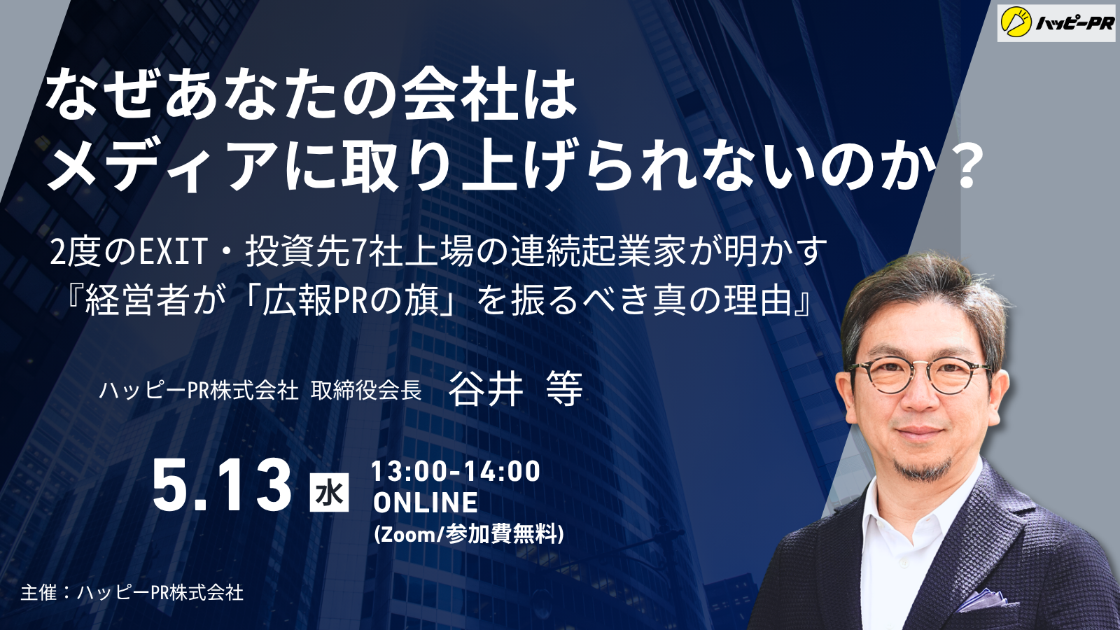 本ウェビナーでは、上場、売却、そして売却した会社を自ら買い戻すという異例の決断まで経験し、自ら広報の旗を振り続けて事業を成長させてきた連続起業家・谷井等(ハッピーPR会長)が、自らの経験をもとに経営者視点から「なぜ経営者自身が広報の旗を振るべきなのか」をお話しします。